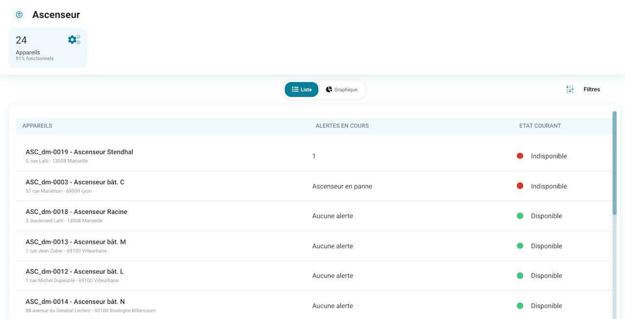 La vue liste est affichée par défaut, est triée par état courant et indique :