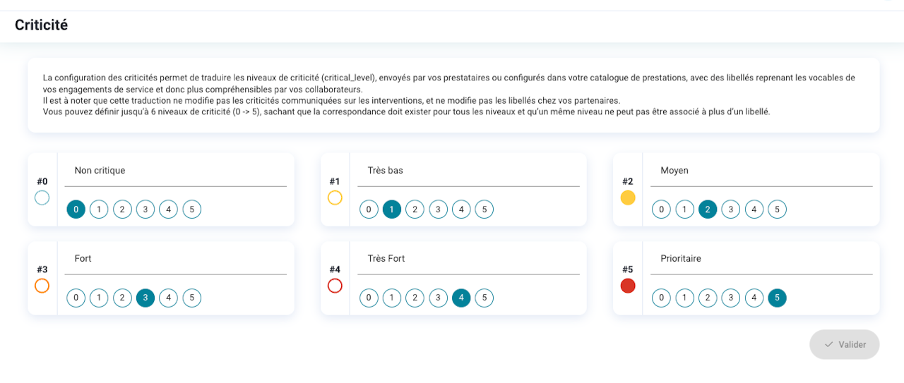 L'entrée "Criticité" offre un contrôle total sur la configuration des niveaux de criticité, permettant de personnaliser les labels et de regrouper des criticités selon les besoins spécifiques de chaque entité utilisateur.