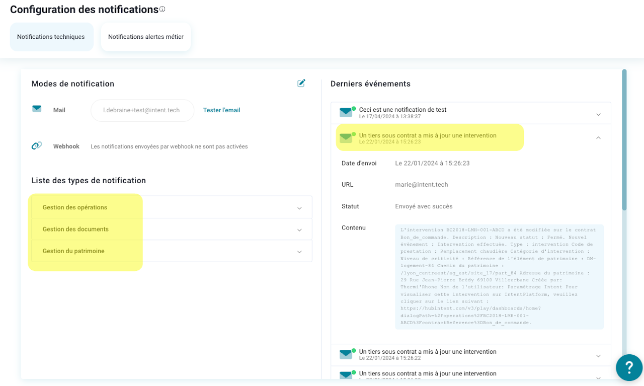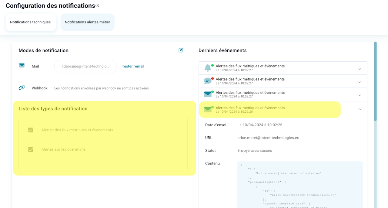 Concernant les notifications alertes métier, les mêmes modes de notification sont disponibles (email et webhook).