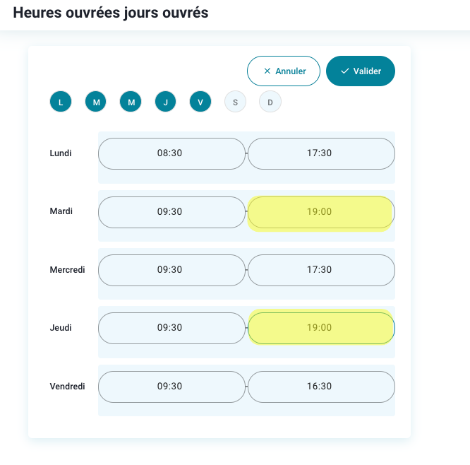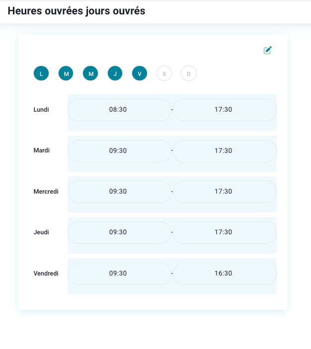 Cet onglet permet de visualiser les heures et jours ouvrés de son entité.