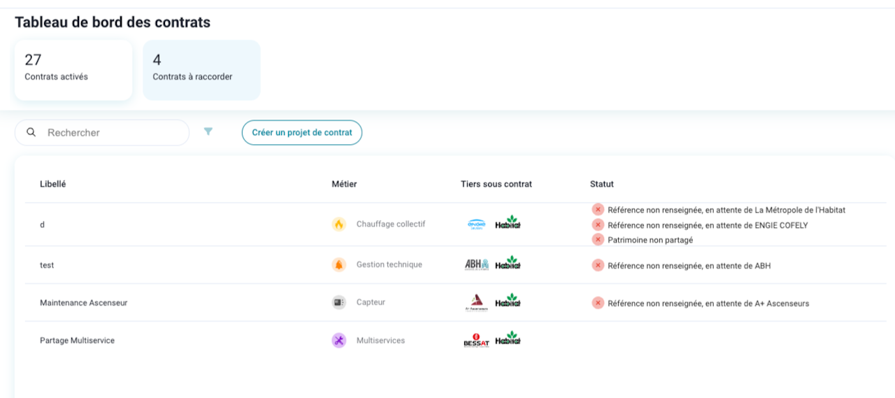 Dans la partie contrats activés, on retrouve la liste de tous les contrats raccordés à la plateforme.