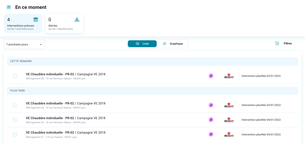 En cliquant sur l'onglet des interventions prévues, la vue liste est affichée par défaut.