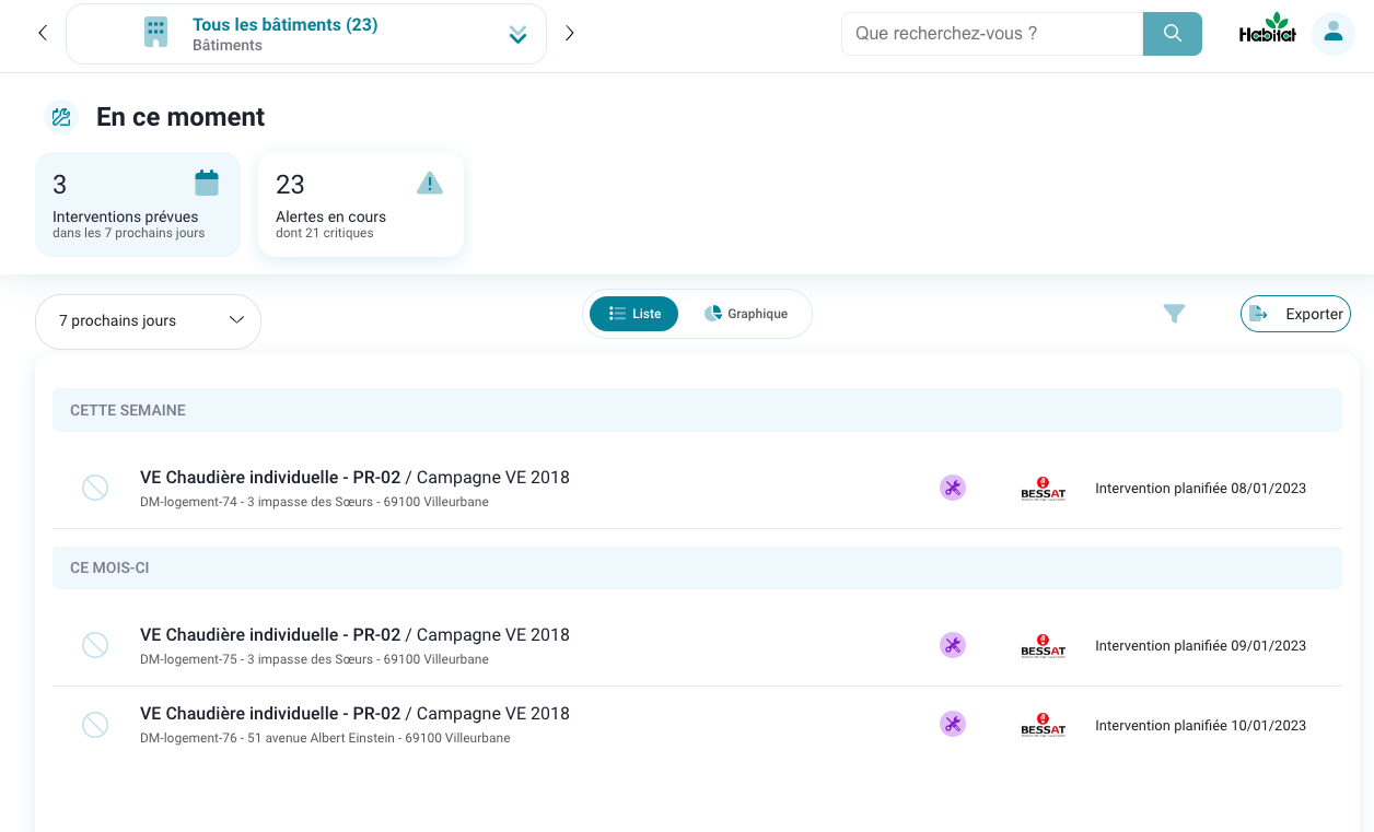 En cliquant sur l'onglet des interventions prévues, la vue liste est affichée par défaut.