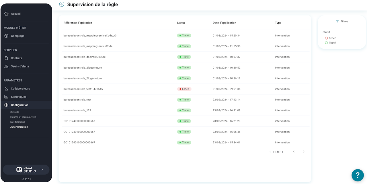 Une page de supervision permet de vérifier l'exécution des règles et les causes de rejet, le cas échéant.