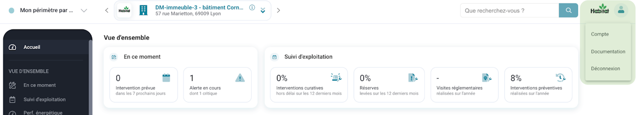 Dans la partie haute, il est possible d'accéder au menu utilisateur en cliquant sur l’icône à droite.