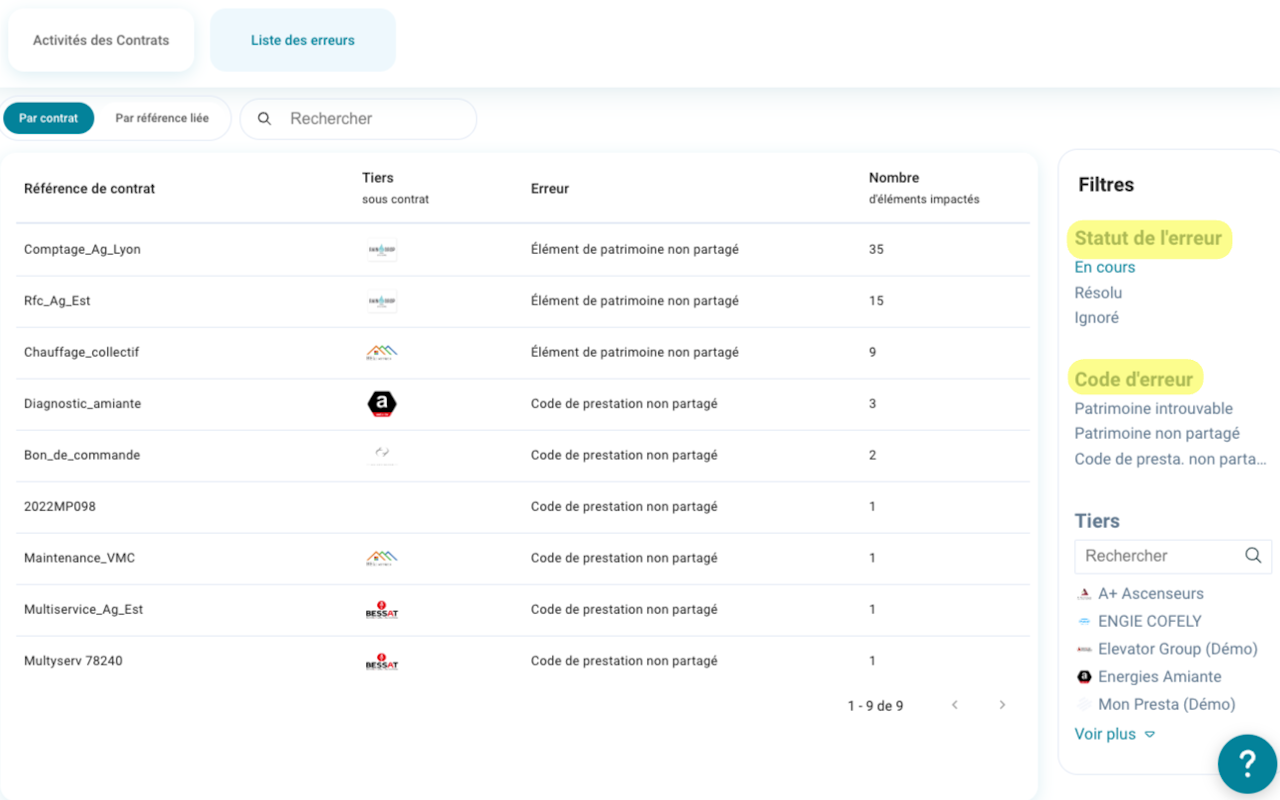 Dans la fiche détail d'un contrat, onglet Etat de santé & Liste des erreurs :