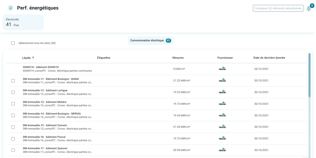 La vue "performance énergétiques" permet de recenser un catalogue de flux, mesurer la consommation énergétique de bâtis, visualiser ces consommations dans le temps ainsi que de les comparer entre elles.