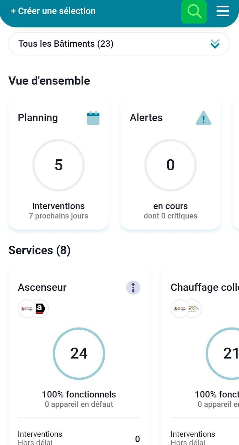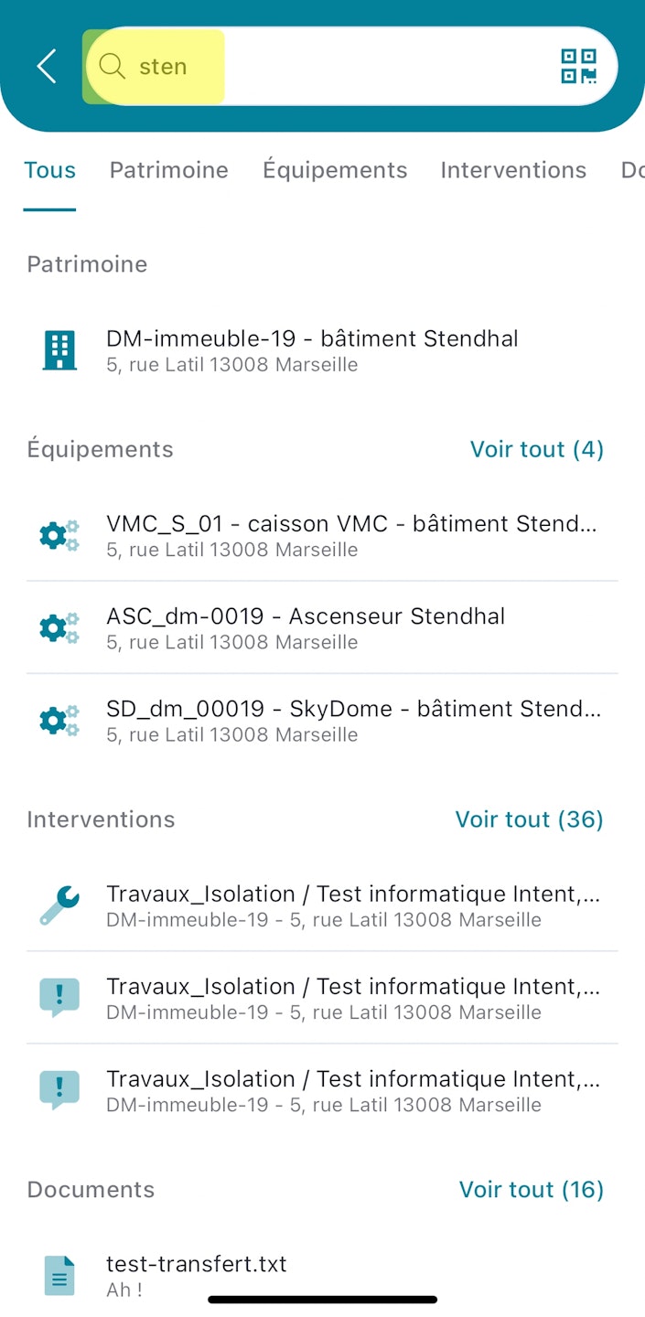 Dans la partie haute, en cliquant sur la loupe un moteur de recherche s'ouvre et permet d'explorer votre patrimoine en utilisant n'importe quelle information liée à votre bâtiment.