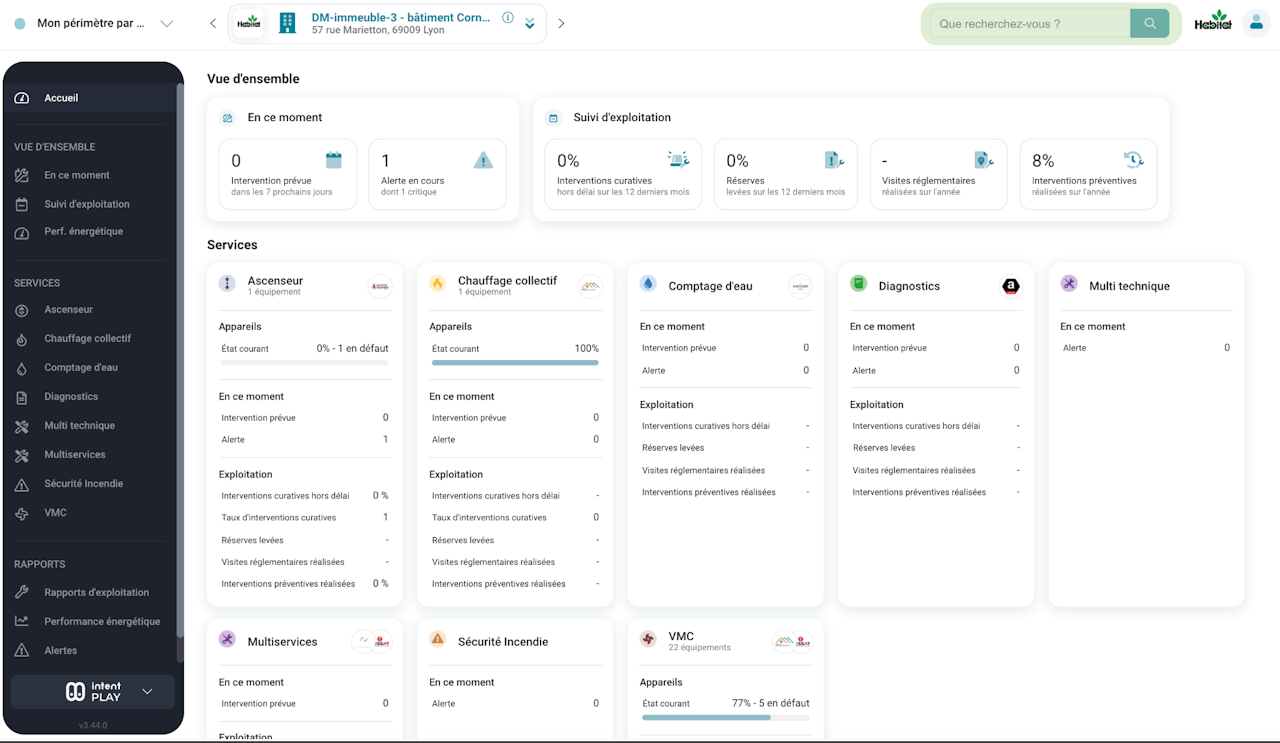 Dans la partie haute, le moteur de recherche permet d'explorer votre patrimoine en utilisant n'importe quelle information liée à votre bâtiment comme son adresse, son nom, le nom d'un locataire...