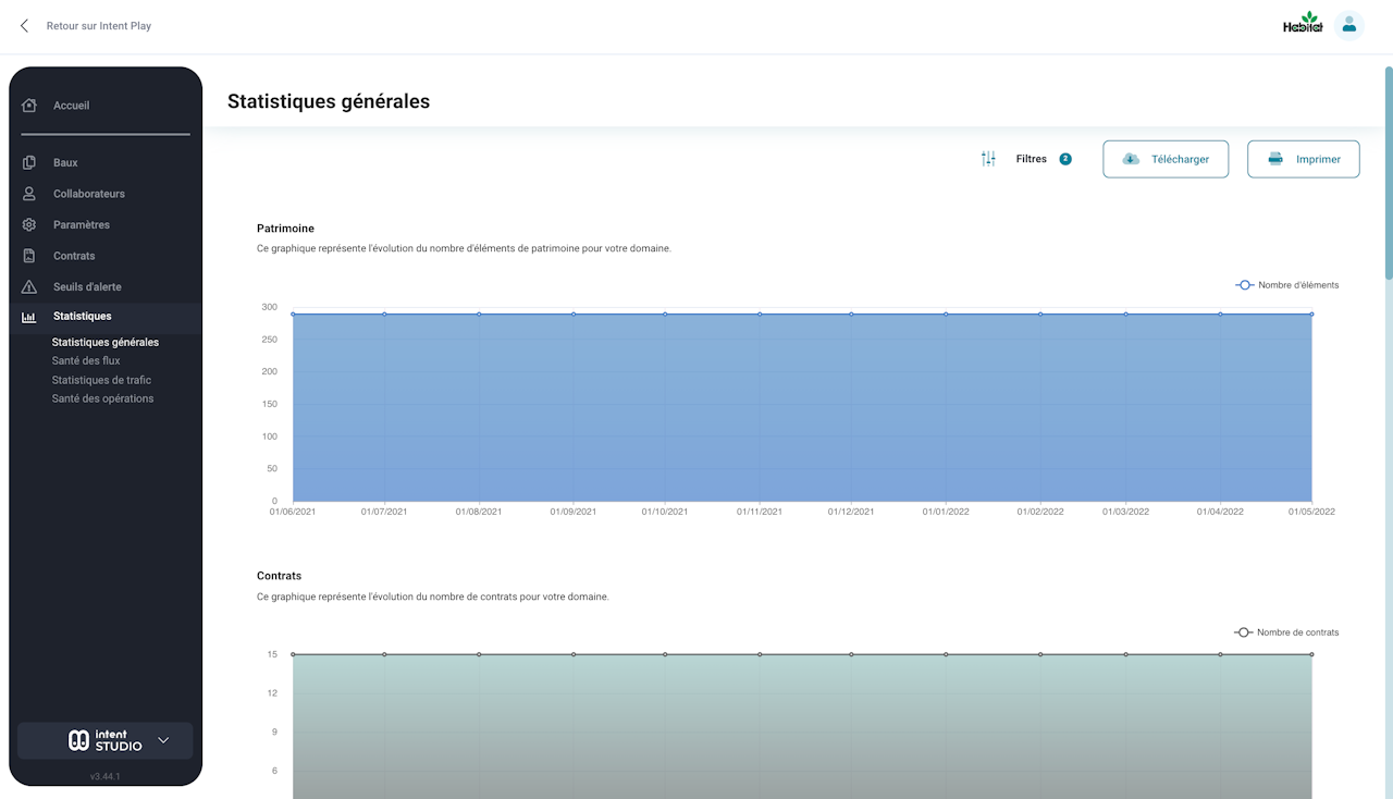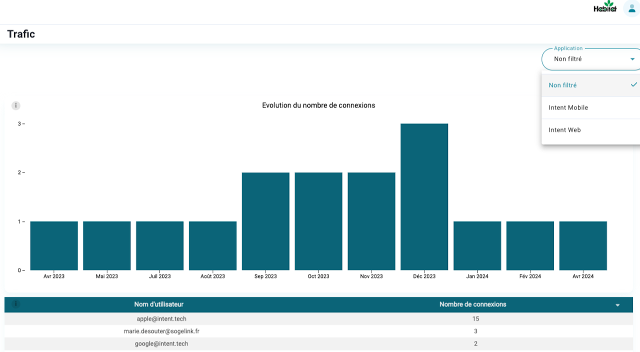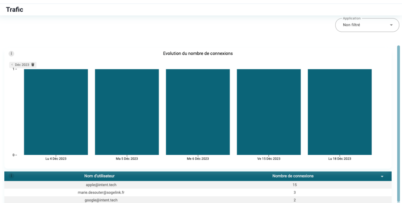 Afin de suivre l'engagement autour de la plateforme, la vue statistiques de trafic présente :