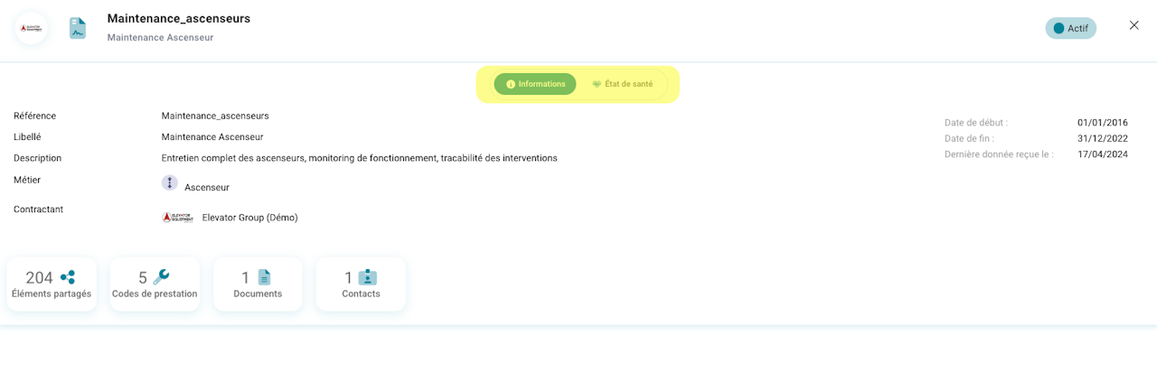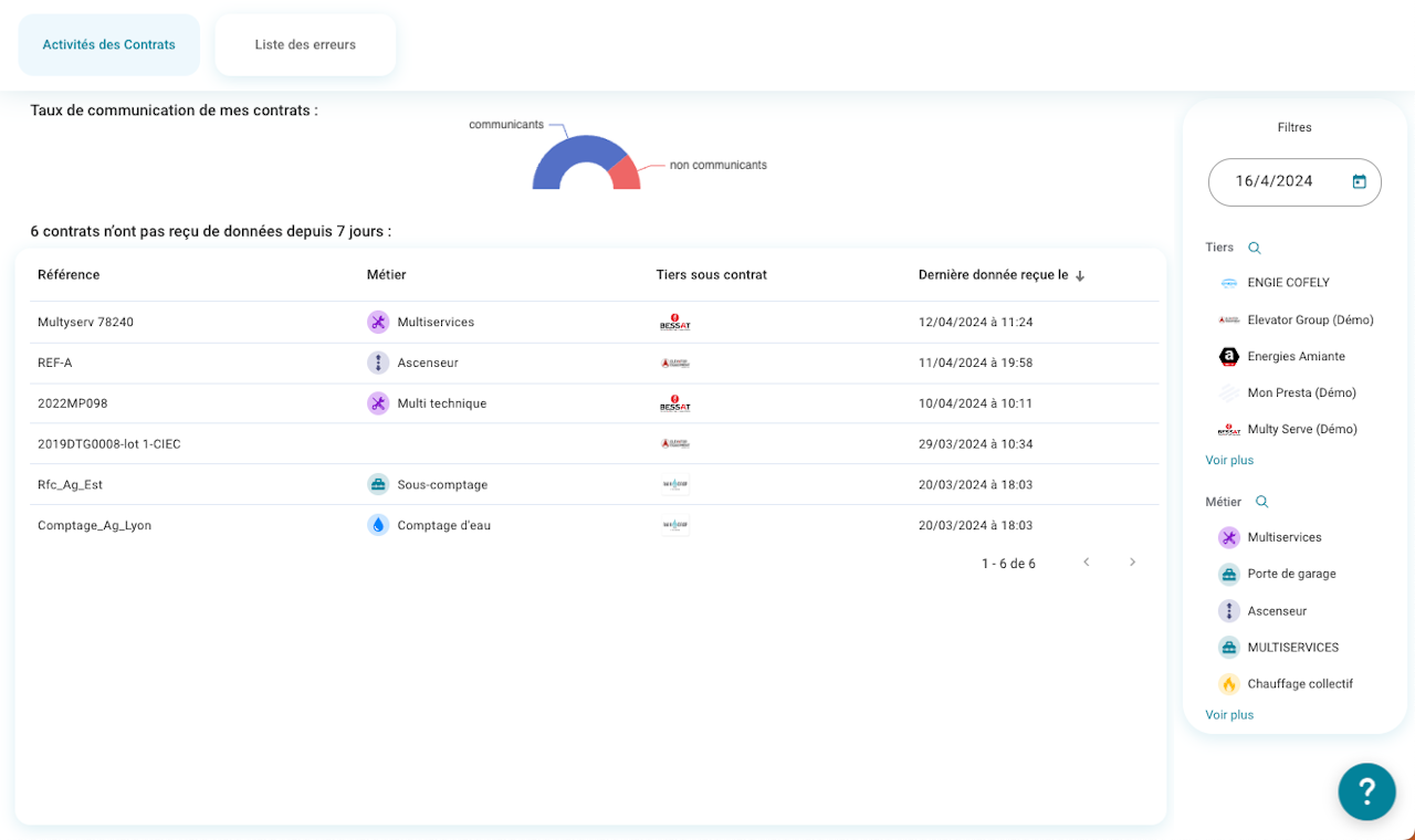 Cela permet dans le premier onglet "Activités des Contrats" de suivre : le taux de communication des contrats et d'identifier les contrats qui n'ont pas reçu de données depuis x jours.