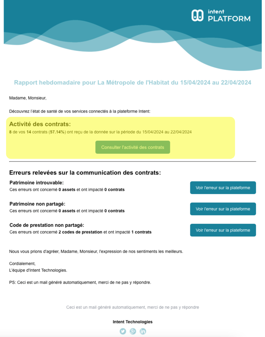 La nouvelle entrée dans Intent Studio "Supervision" permet de superviser la communication de vos contrats présents sur la plateforme.